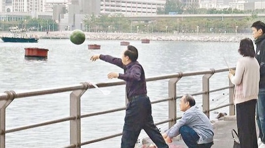點知1秒鐘後,佢真係將個足球仔都掟出欄杆外……好彩我知海旁欄杆外仲有個防波堤,而個波只係跌落入喺防波堤度而已