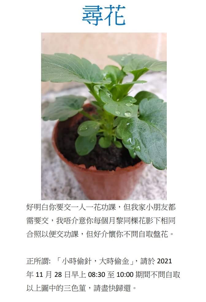 小時偷針,大時偷金 上學篇 2021 年 11 月 29 日 ParentLicenses 瀏覽次數: 1,669 #ParentLicenses1577 一人一花嘅利害好明白你要交一人一花功課,但我家小朋友都需要交,我唔介意你每個月嚟同棵花影下相同合照以便交功課,但好介懷你不問自取盤花正所謂:「小時偷針,大時偷金」,請於 2021年11月28 日早上 08:30 至10:00 期間不問自取以上圖中的三色蓳,請盡快歸還圖片來源@迷失媽媽讀者投稿@迷失媽媽