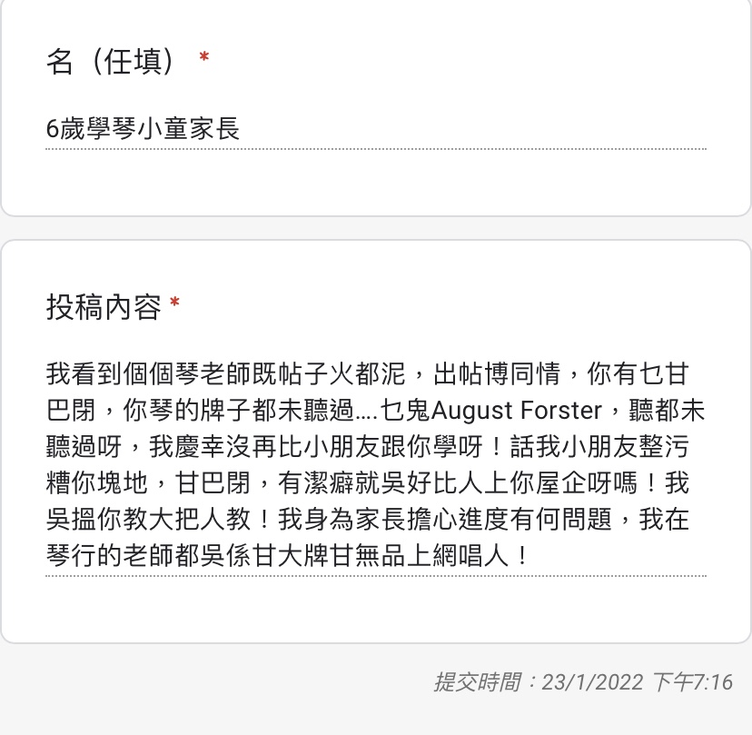 我唔搵你教大把人教! 上學篇 2022 年 1 月 23 日 ParentLicenses 瀏覽次數: 14,109 #ParentLicenses1654 #疑似肇事者回應 我看到個個琴老師既帖子火都泥,出帖博同情,你有乜甘巴閉,你琴的牌子都未聽過….乜鬼August Forster,聽都未聽過呀,我慶幸沒再比小朋友跟你學呀!話我小朋友整污糟你塊地,甘巴閉,有潔癖就吳好比人上你屋企呀嗎!我吳搵你教大把人教!我身為家長擔心進度有何問題,我在琴行的老師都吳係甘大牌甘無品上網唱人!讀者投稿@6歲學琴小童家長 故事源起 肇事者回應 投稿者回覆 投稿者補充