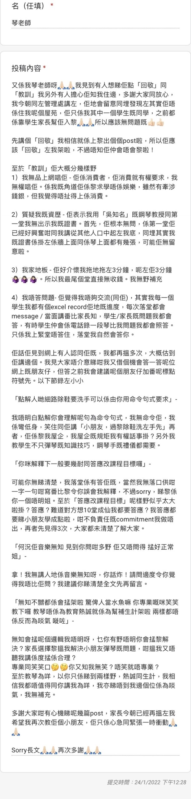 「無知不嬲都係會掹㗎啦,驚俾人當水魚嘛,你專業嘅咪笑笑教下囉,教琴唔係為教育熱誠就係為幫補生計㗎啦,兩樣都唔係反而為啖氣,嘥咗」