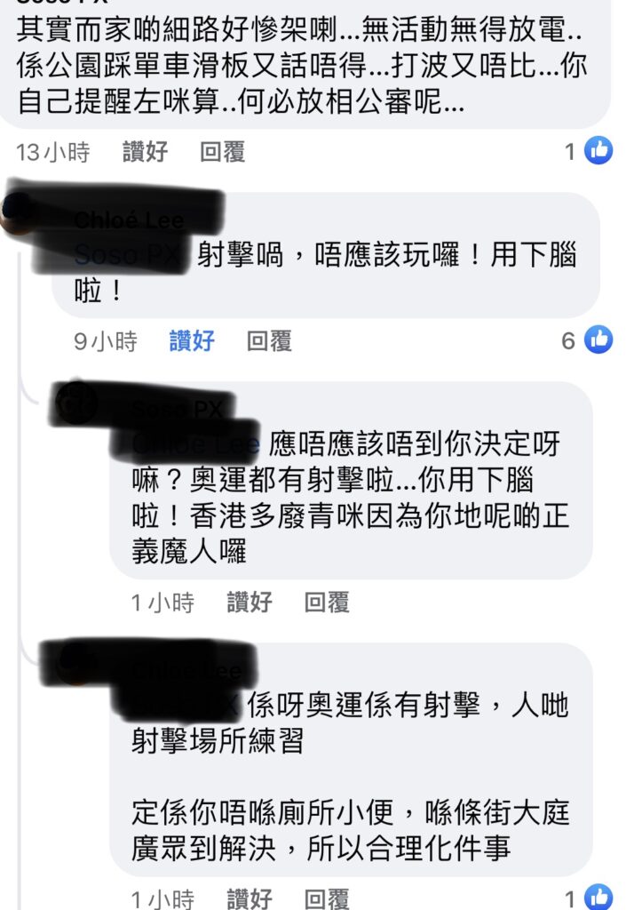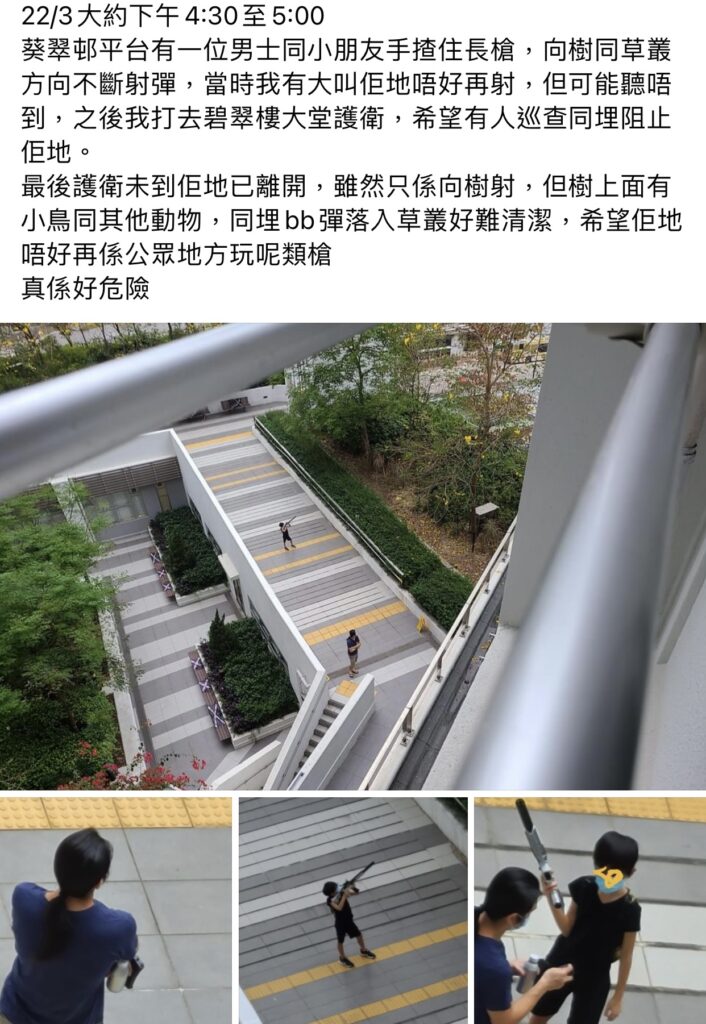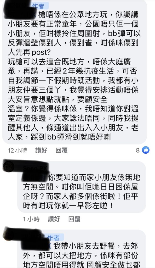 點解有人會覺得攞住支槍周圍射係冇問題? 玩樂篇 2022 年 3 月 28 日 ParentLicenses 瀏覽次數: 2,322 #ParentLicenses1699 事源係咁,喺某群組見到有住客投訴小朋友喺平台玩BB彈槍發文嘅樓主就覺得小朋友就算唔係射人都唔係咁好,我自己覺佢講得好啱,就算冇射人,射到動物都唔好啦,啲BB彈喺地下又會冼到人之後就見到留言區有個人話小朋友冇得放電好慘,小小嘢都要擺出嚟公審,完全覺得玩槍周圍射冇問題我自己咁諗啦,小朋友放電可以有好多選擇,既然家長帶得小朋友落街,點解一定要玩槍呢?點解攞住支槍周圍射有人會覺得冇問題?讀者投稿@No name 某群組原文節錄: