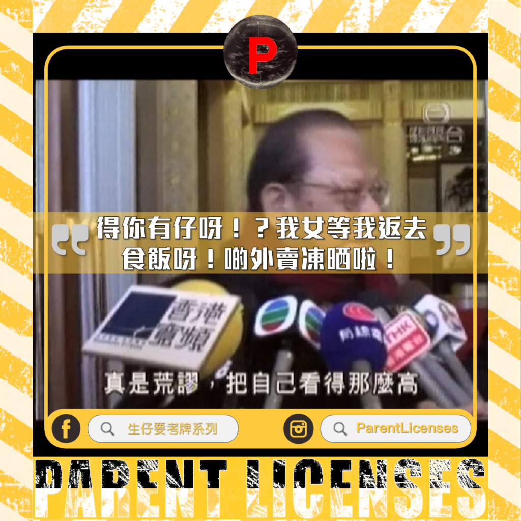 有啲發脾氣就話:「得你有仔呀!?我女等我返去食飯呀!啲外賣凍晒啦!」