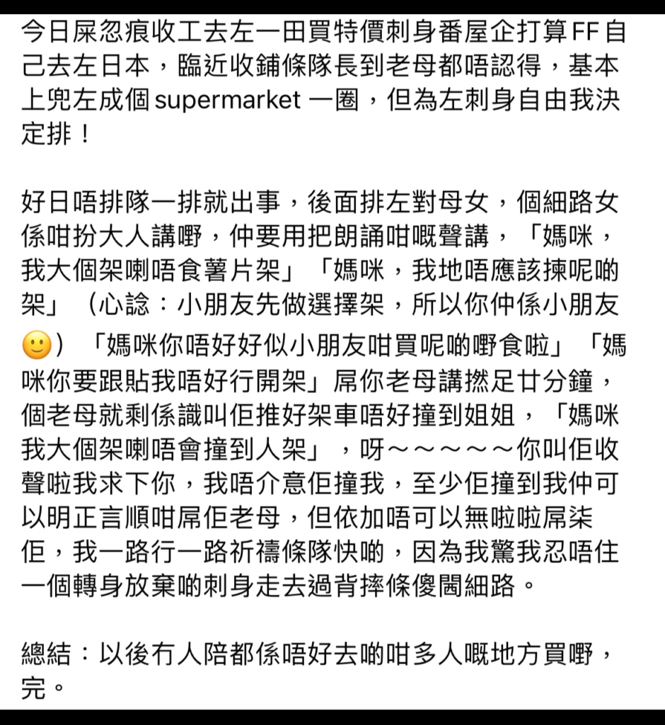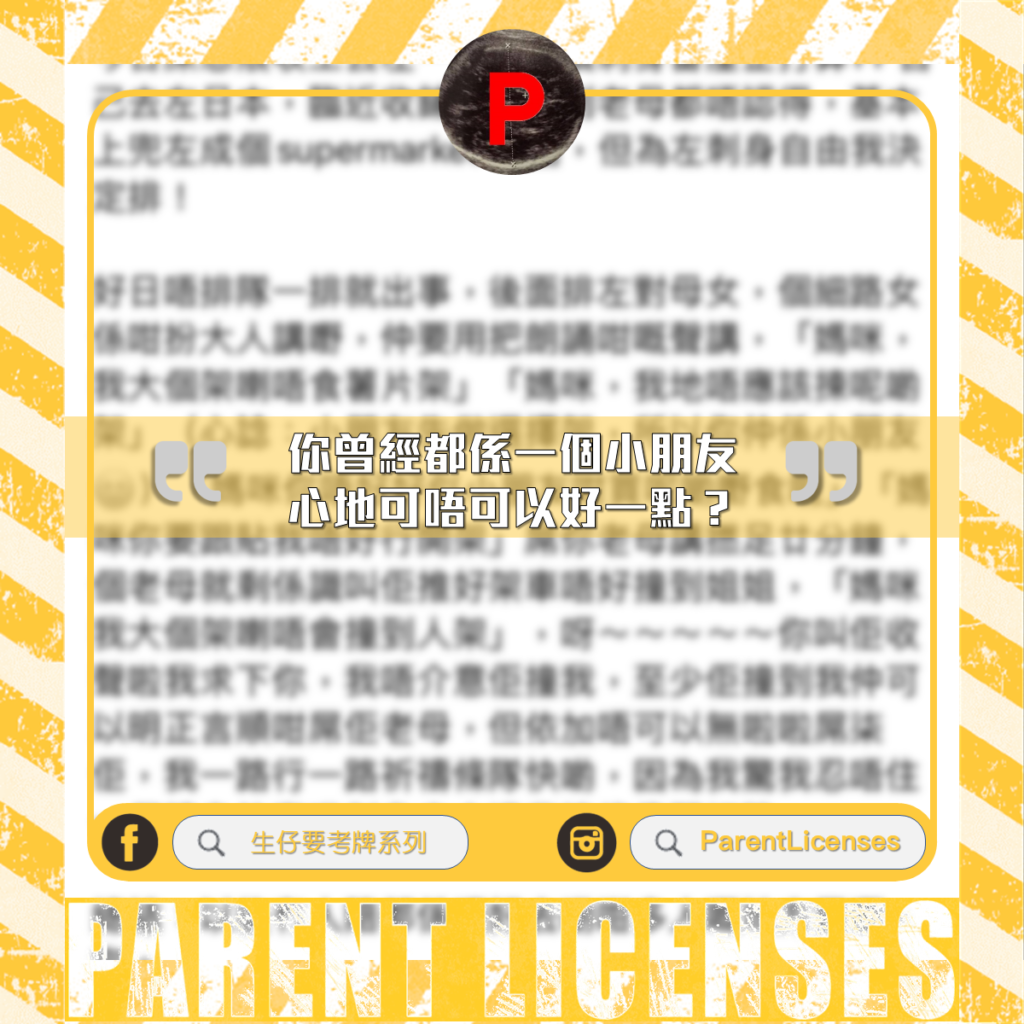 你曾經都係一個小朋友,心地可唔可以好一點? 出門篇 2022 年 5 月 4 日 ParentLicenses 瀏覽次數: 6,729 #ParentLicenses1722 碌碌下fb,見到有人(朋友的女友)公開分享咗呢篇日常 其實怕多人、怕小朋友的話,真係唔好出街,而且你曾經都係一個小朋友,心地可唔可以好一點?圖片來源@—讀者投稿@—