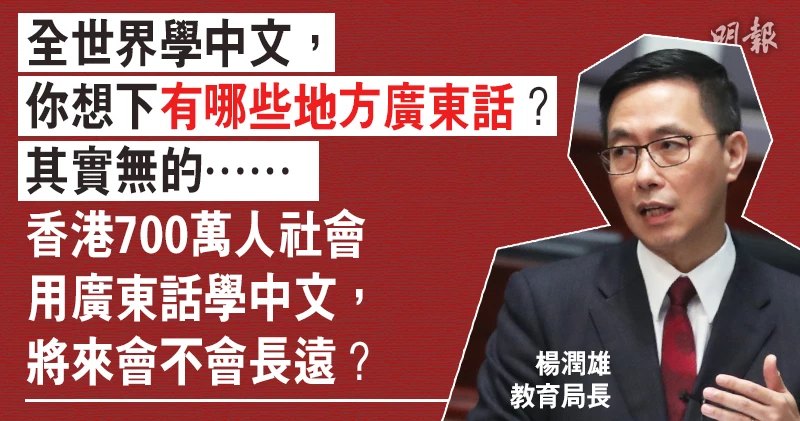 現任教育局局長楊潤雄去年曾經表示:「我母語是廣東話,很多時學界都在爭議的是,應該用普通話還是廣東話去教授中文呢?我的看法是,廣東話對香港而言是優勢,很多人亦表示是要用廣東話才可帶出古詩詞歌賦的韻味,但同一時間,在日常用語和生活中,若然能夠用多點普通話表達,是否會更好呢?」