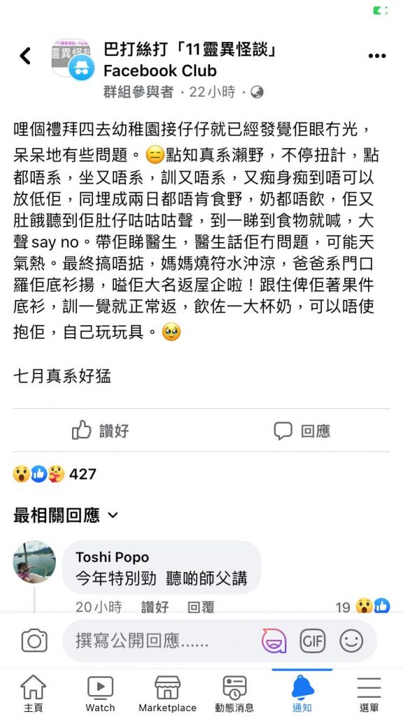 哩個禮拜四去幼稚園接仔仔就已經發覺佢眼冇光,呆呆地有些問題。😑點知真系瀨野,不停扭計,點都唔系,坐又唔系,訓又唔系,又痴身痴到唔可以放低佢,同埋成兩日都唔肯食野,奶都唔飲,佢又肚餓聽到佢肚仔咕咕咕聲,到一睇到食物就喊,大聲say no。帶佢睇醫生,醫生話佢冇問題,可能天氣熱。最終搞唔掂,媽媽燒符水沖涼,爸爸系門口羅佢底衫揚,嗌佢大名返屋企啦!跟住俾佢著果件底衫,訓一覺就正常返,飲佐一大杯奶,可以唔使抱佢,自己玩玩具。🥹