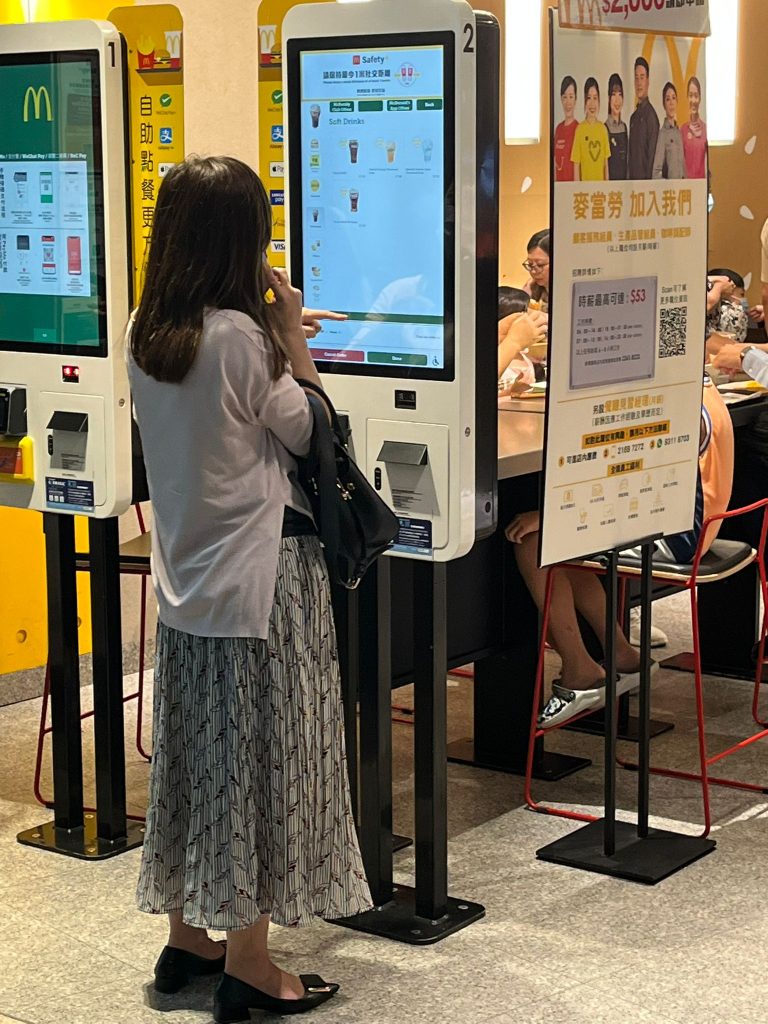 喺麥當奴買早餐,當時每部自動售賣機都排緊5, 6個人,其中兩部都各有一個小朋友篤緊,其實係玩緊部機