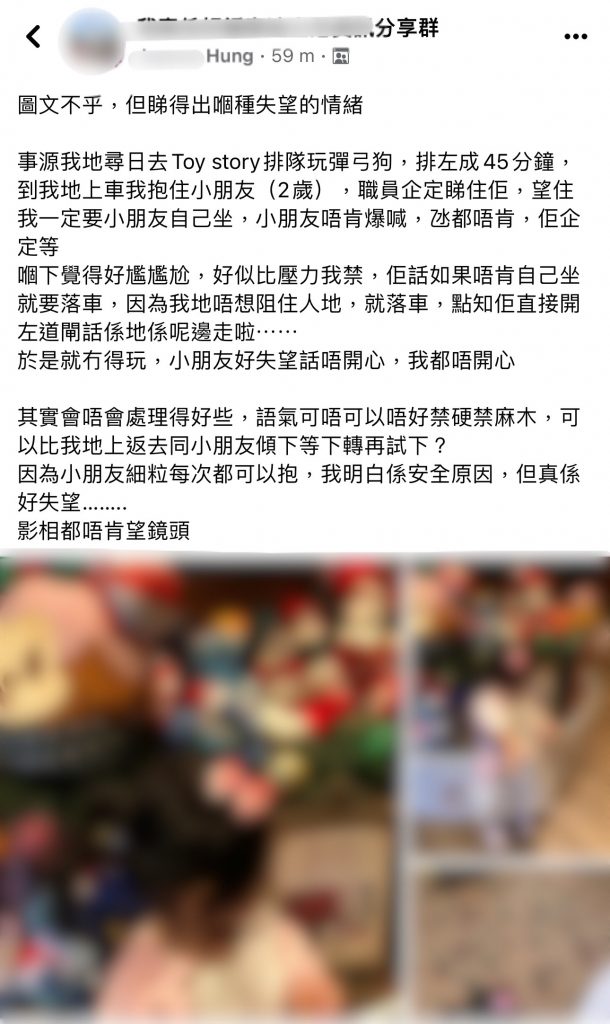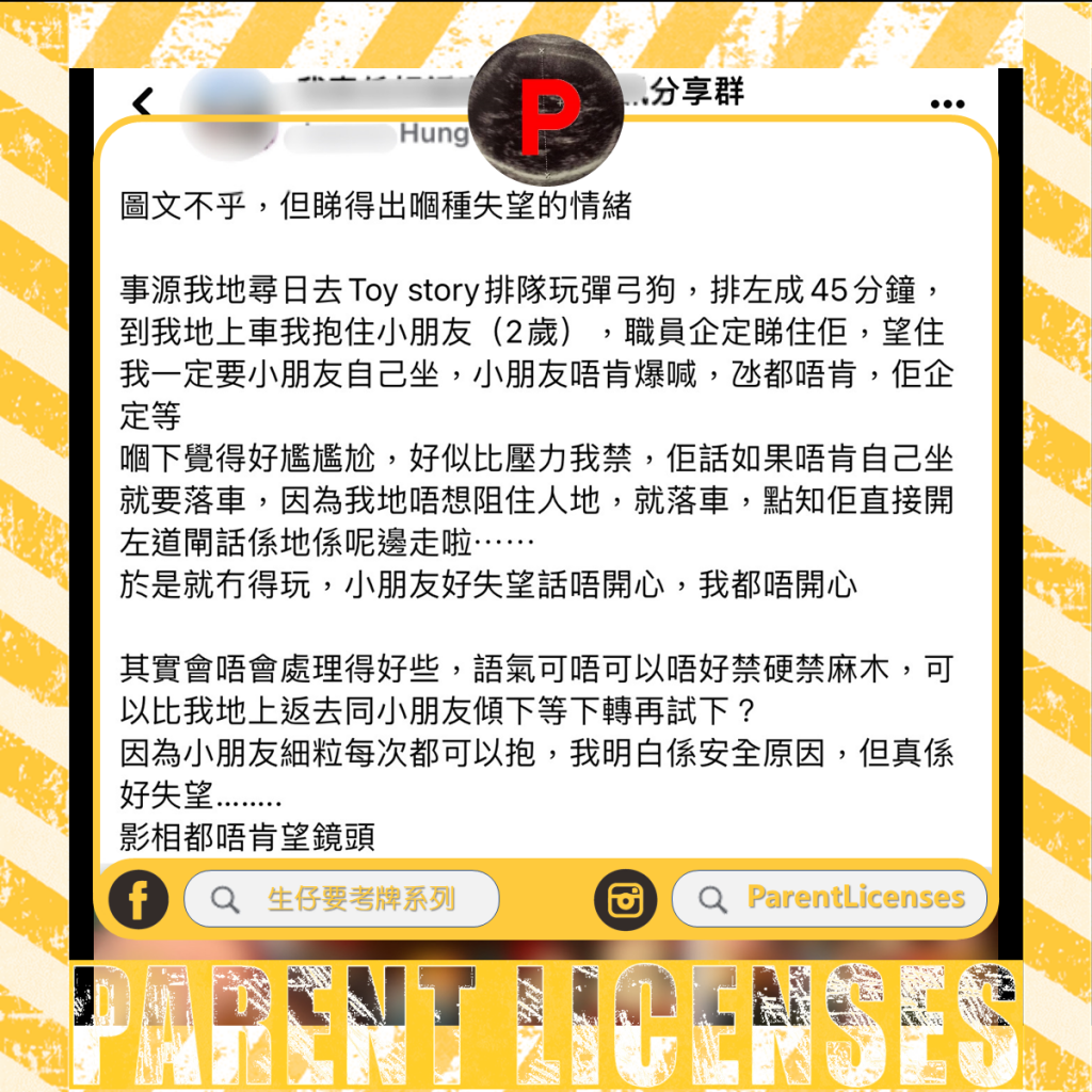 安全唔係第一 玩樂篇 2022 年 12 月 10 日 ParentLicenses 瀏覽次數: 2,135 #ParentLicenses2019 其實一直以嚟樂園都係安全第一,玩過彈弓狗嘅人都應該感受過佢嘅離心力,點解呢啲港媽重可以大條道理怪員工唔俾佢抱小朋友坐大髀玩?重要怪人麻木同語氣強硬,真係唔該自己負責返你自己小朋友嘅情緒,冇人有責任去氹你個小朋友開心 圖片來源@Disney港孩集中地 另外睇到其中有個留言講得好啱,唔好以為自己着咗公主裙就係公主,全世界圍住你轉,你哋有嘅係「公主病」咋讀者投稿@Disney港孩集中地