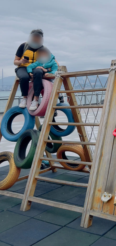 今日帶咗小朋友去卑路乍灣玩,其中一個車轆攀爬架上面坐咗個家長喺度,而佢嘅小朋友就去咗附近玩其他嘢