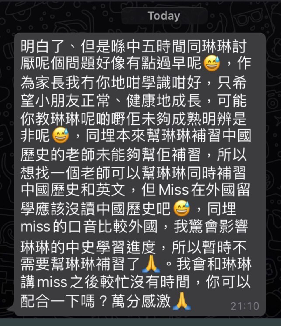 補習老師又唔係教唆個學生啲乜嘢,點解會同點樣影響到個學生嘅家庭觀念?況且個學生都中五啦,咁大個人會唔明?當佢弱智㗎?