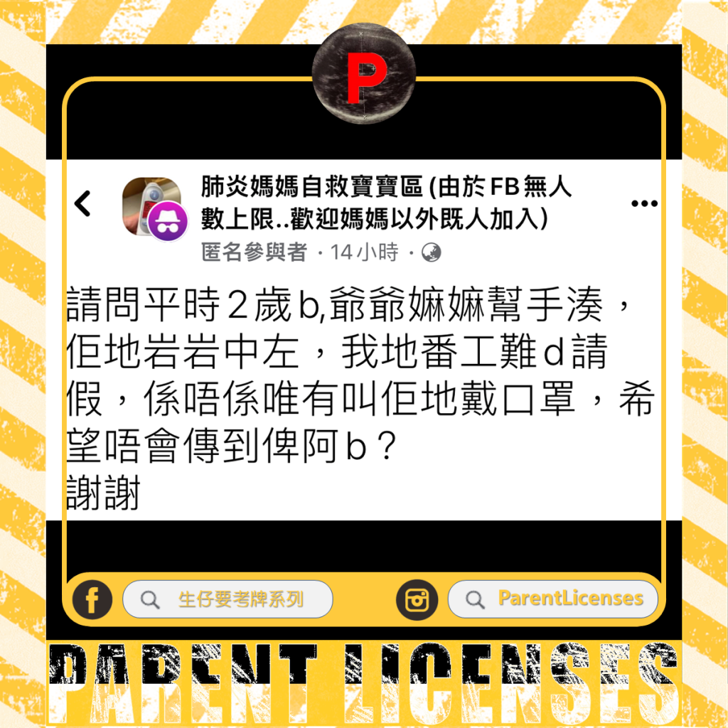 腦霧 疫情篇 2023 年 5 月 7 日 ParentLicenses 瀏覽次數: 2,238 圖片來源@Sam #ParentLicenses2142 有媽媽喺Covid Facebook page提問,問題係佢老爺奶奶中咗,而佢同老公都難請假,係咪唯有叫兩老戴口罩湊個兩歲小朋友讀者投稿@Sam