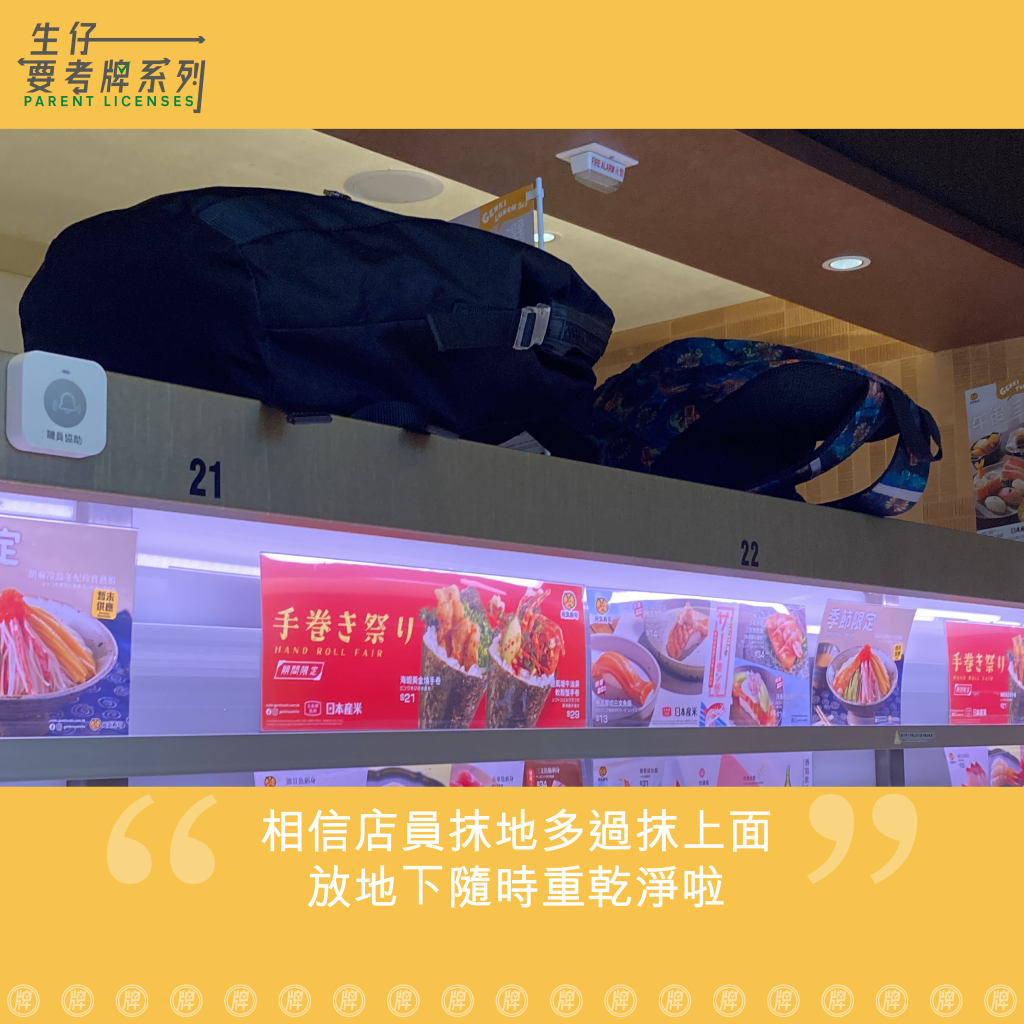 智商堪憂 食肆篇 2023 年 6 月 26 日 ParentLicenses 瀏覽次數: 4,084 #ParentLicenses2190 去食壽司,全店爆滿未幾,見到有個家長將個袋放喺個空位度,霸多個位,要由店員叫先不情願攞返起明明店員已提咗枱下有空間放袋,但家長可能見到係「高速線」就以為自己真係搭緊日本列車,一個屈尾十,乘人不覺即刻將個袋放上到輸送帶上方空間 圖片來源@眼都歪 其實咁樣真係會乾淨啲嗎?我相信店員抹地多過抹上面,放地下隨時重乾淨啦!智商堪憂文章來源:讀者投稿@眼都歪
