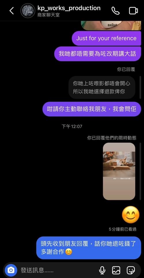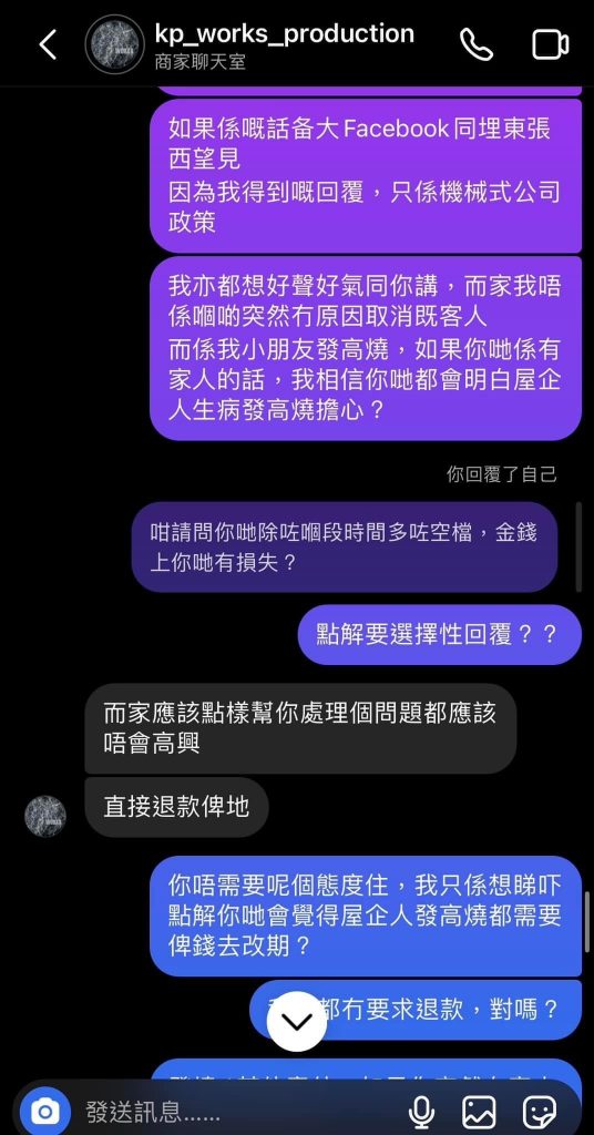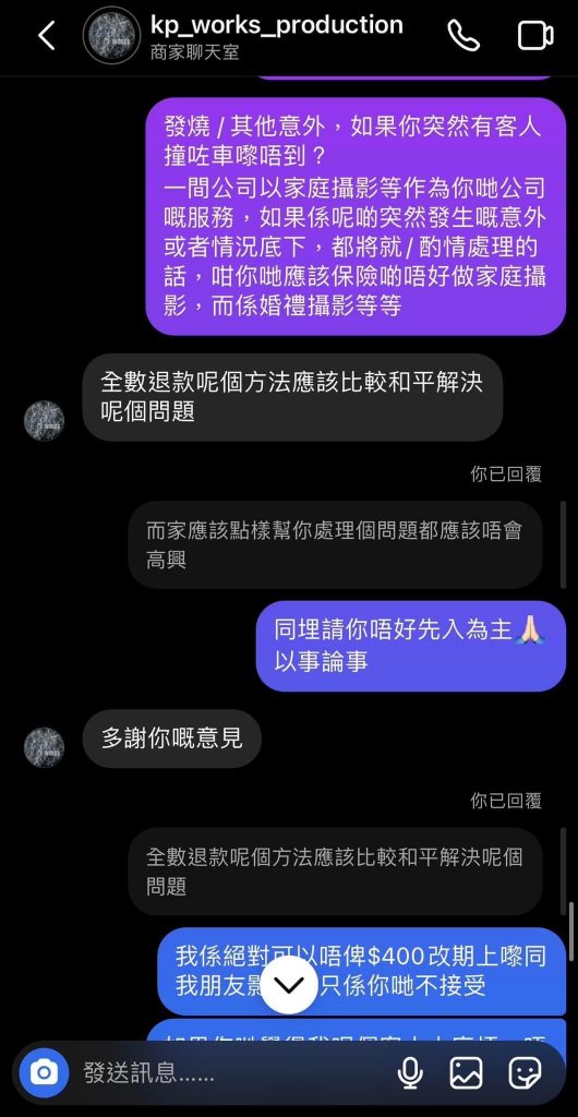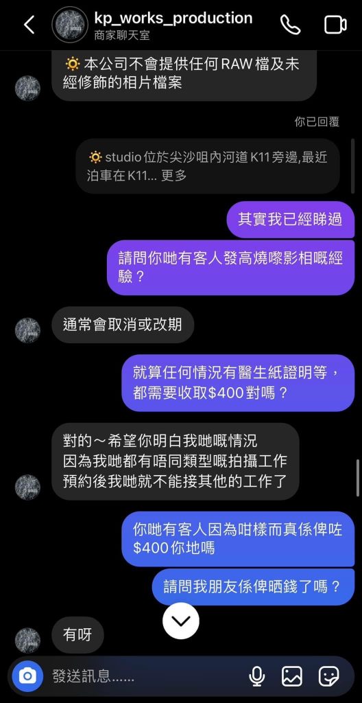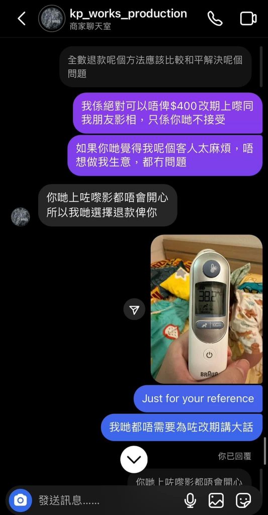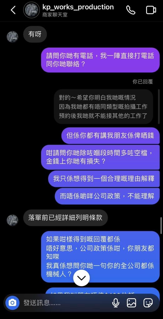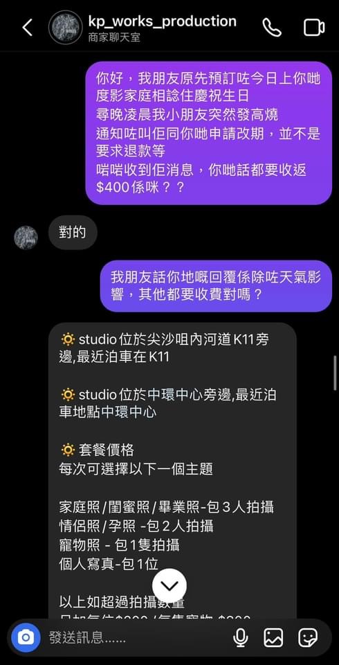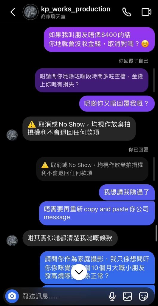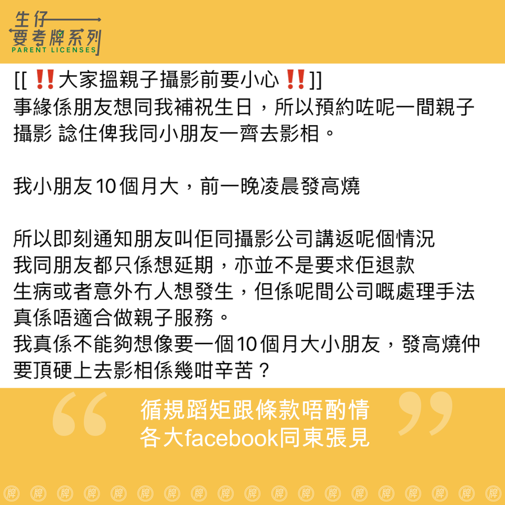 規矩?食得嘅 出門篇 2023 年 8 月 13 日 ParentLicenses 瀏覽次數: 5,911 #ParentLicenses2256 事源有個阿媽同BB去影親子相,但因前一日個BB發高燒,個阿媽就同攝影公司交涉攝影公司一再表明,按條款所述如要改期費用為$400,而且於銷售服務時有列明清楚。然而個阿媽堅持不接受,話自己知道條款有寫,但仍辯解生病並唔係佢想發生嘅事云云 圖片來源@Wing 圖片來源@Wing 圖片來源@Wing 圖片來源@Wing 圖片來源@Wing 圖片來源@Wing 圖片來源@Wing 圖片來源@Wing 讀者投稿@Wing