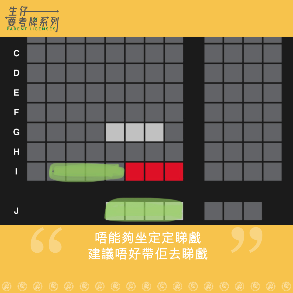 剛開場時,有兩個媽媽帶住六個小朋友入嚟(兩男兩女嘅小學生,另外兩個分別係兩歲零同四歲零嘅小朋友)。佢哋一行八人分開坐,分別坐喺圖中嘅綠色位置。我哋隔籬嗰四個位係小學生自己坐,而兩個媽媽就同兩個細啲嘅小朋友坐喺我哋後面