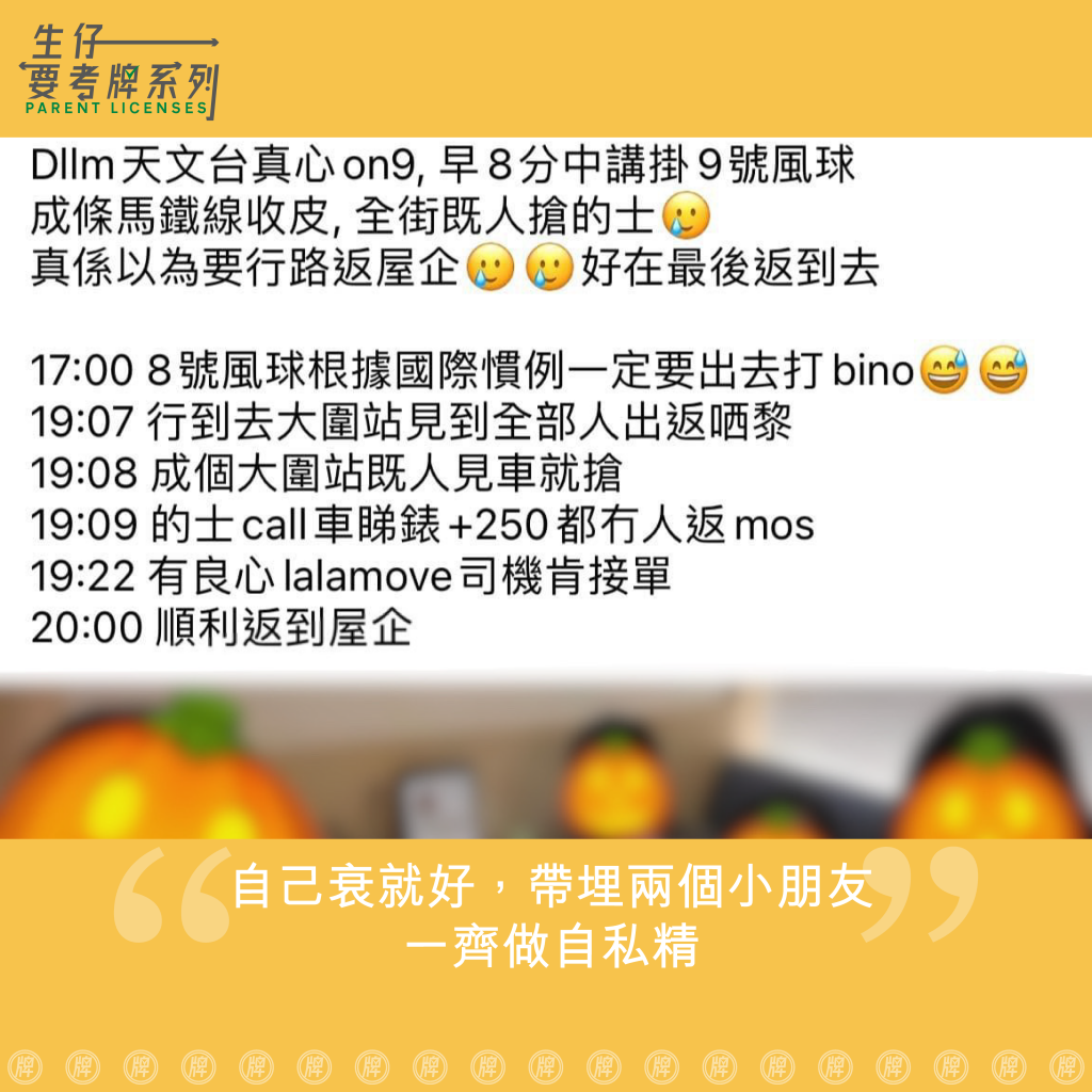 國際慣例 出門篇 2023 年 10 月 10 日 ParentLicenses 瀏覽次數: 2,360 #ParentLicenses2321 武漢肺炎又好,黑雨又好,八號波又好,同樣會帶小朋友週圍飲飲食食,好似唔出街食會死咁今日八號風球,繼續按佢哋屋企慣例一定要躝出街,重好意思怪人哋天文台。有好多人要返工冇辦法,放工遇上九號波冇車返屋企,重要同呢啲貪玩貪食嘅自私友搶call車 圖片來源@A 自己衰就好,帶埋兩個小朋友一齊做自私精讀者投稿@A