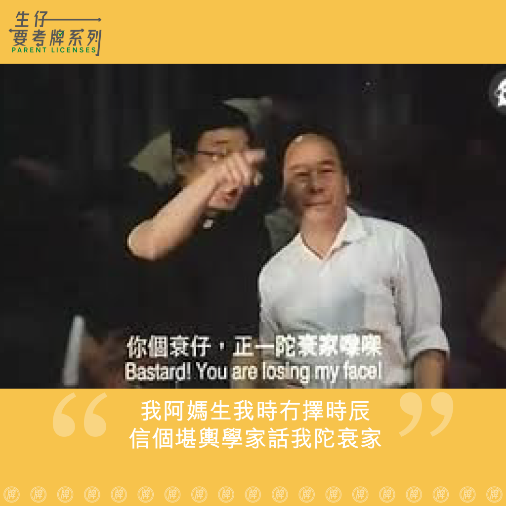 喺節目入邊嗰個不知所謂嘅老母搵師傅擺個驅走小三陣,我阿媽又係好迷信,唔知邊一個黑心「堪輿學家」同佢講順產我嘅時候冇擇時辰,所以陀衰家,叫佢記得要生返個仔先至可以平衡家庭生態