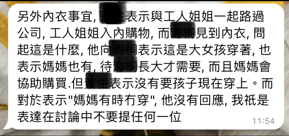 當時我get到係爸爸叫佢戴bra(順帶一提,我女而家六歲)。阿女再講:「爸爸話媽咪唔著」