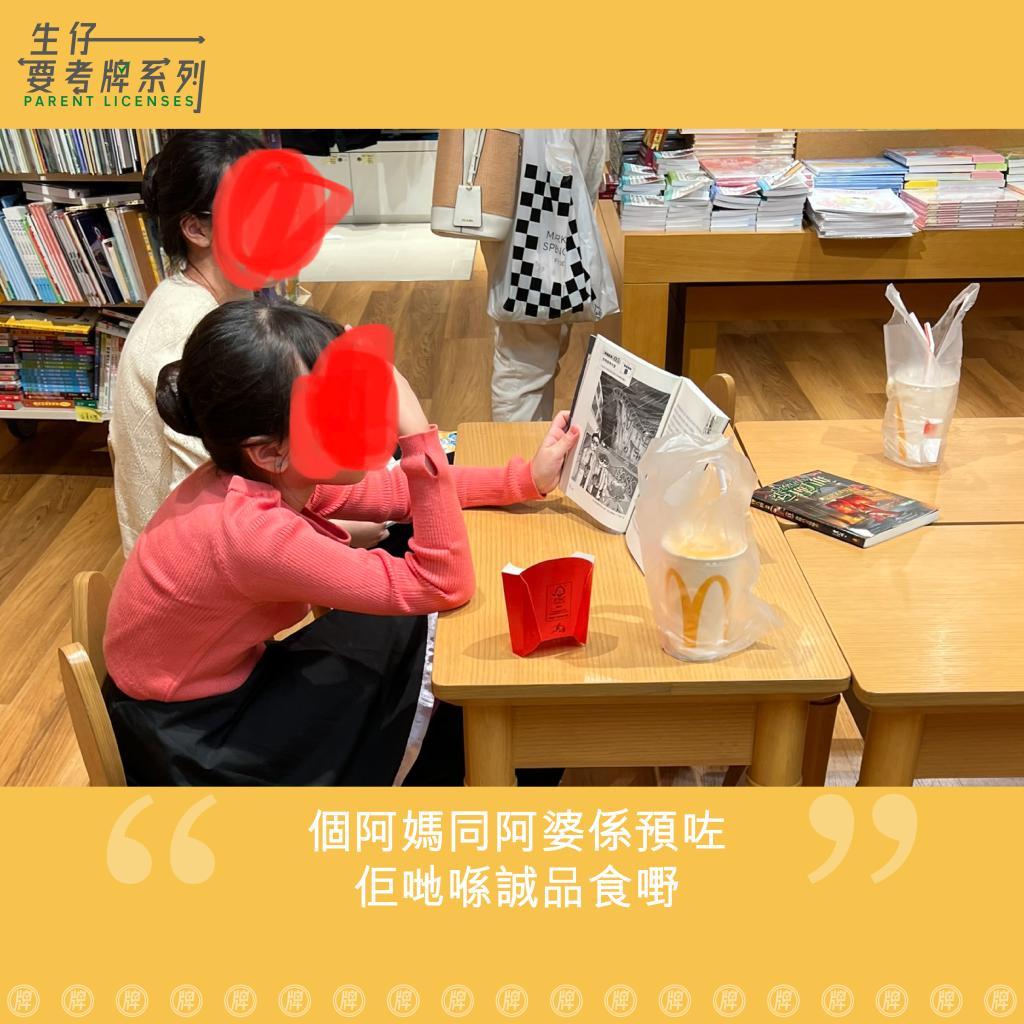 JapJap聲 出門篇 2024 年 1 月 14 日 ParentLicenses 瀏覽次數: 1,689 #ParentLicenses2428 個阿媽同個阿婆放低三個小朋友同埋麥當勞外賣就走咗,留低佢哋喺誠品睇書 圖片來源@Winnie 佢哋一路睇書,一路飲汽水、食薯條,完全唔覺有問題,最後我叫職員勸佢哋唔好再食個阿媽同阿婆係預咗佢哋喺誠品食嘢的,真係好冇公德心讀者投稿@Winnie