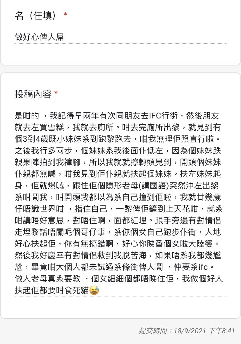 開頭個妹妹仆親都無喊,我就扶起佢,一扶起妹妹,佢就爆喊,跟住佢個隱形老母(講國語)突然衝咗出嚟係咁鬧我