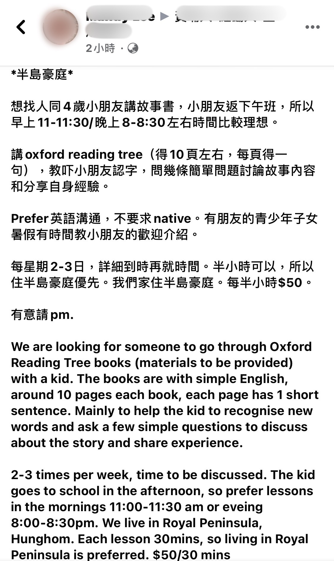 小朋友真係慘😭 住家篇 2021 年 10 月 12 日 ParentLicenses 瀏覽次數: 1,968 #ParentLicenses1500 出post請人同自己4歲嘅小朋友講bed time story,出價半個鐘$50,而且最好本身都住半島豪庭(住得近很重要,所以post中講足三次)我覺得小朋友真慘,佢老母竟然連講故事時間都冇😭讀者投稿@半島豪庭天台住客