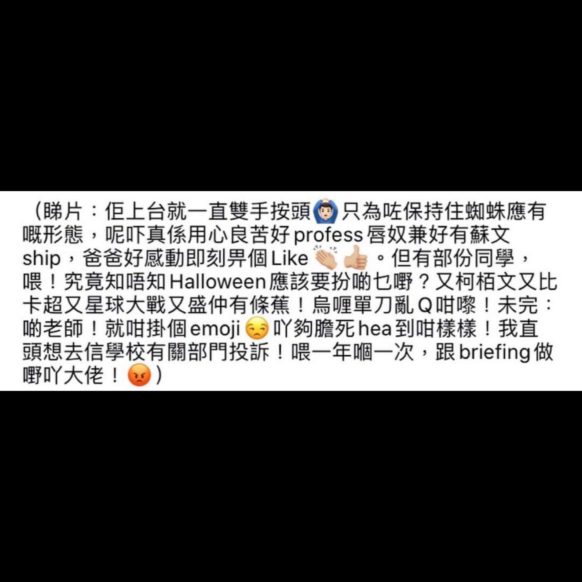 然後就見到一位爸爸話自己個仔好投入扮演蜘蛛,好叻仔咁。繼而投訴其他同學仔、老師亂咁扮,甚至話想寫信返學校投訴……
